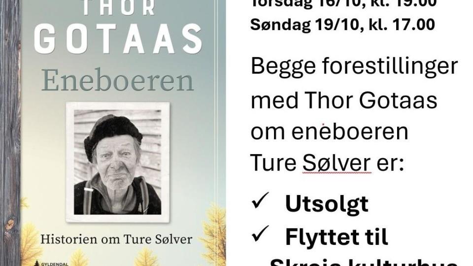 Utsolgt og flyttet OBS! Begge forestillinger med Thor Gotaas om eneboeren Ture Sølver er UTSOLGT OG FLYTTET til Kulturhuset på Skreia.Biblioteket stenger kl. 17.00 torsd...